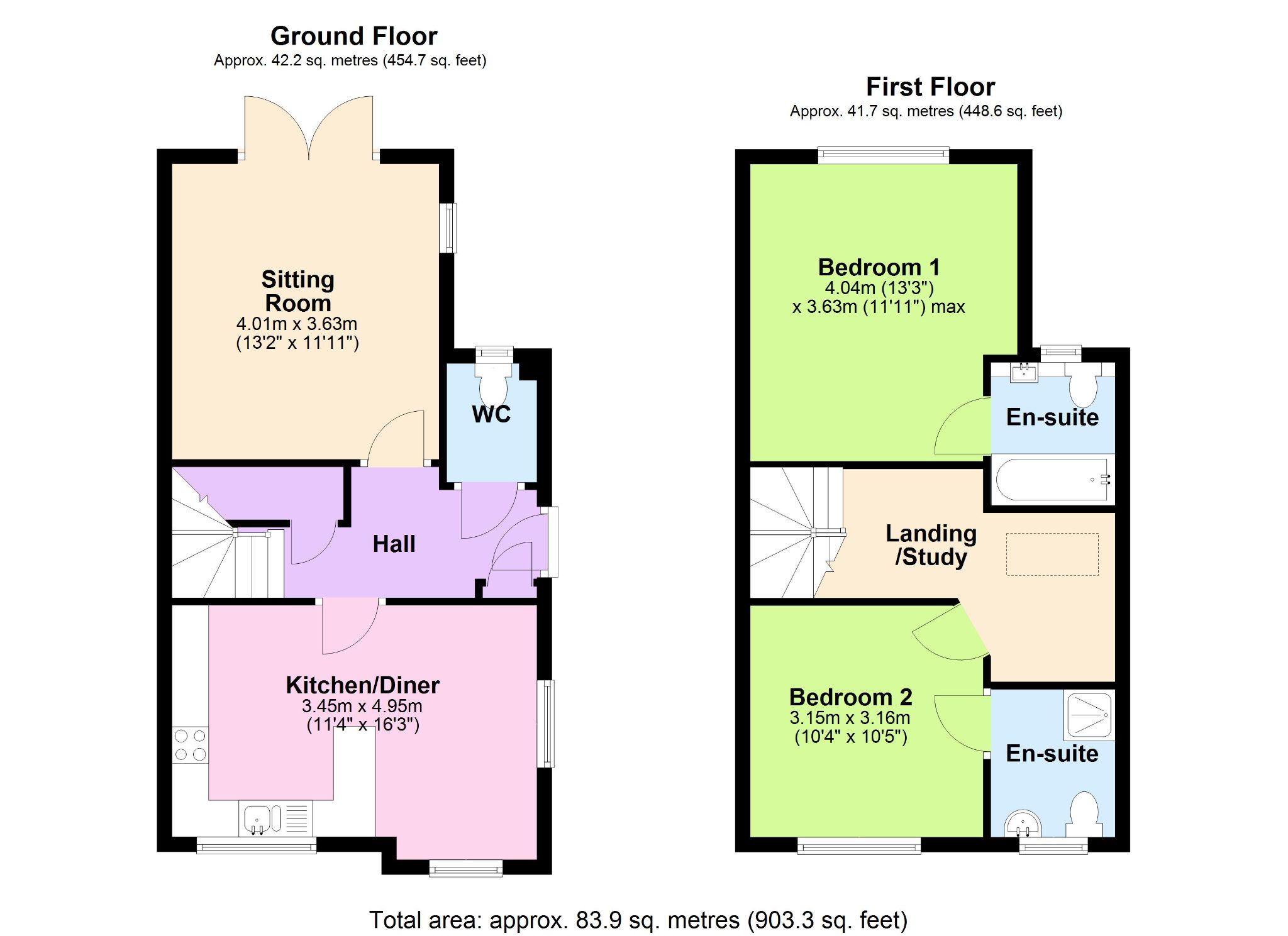 Upstairs, the home comprises two generously sized double bedrooms, each benefitting from its own ensuite bath/shower room – an especially attractive feature for those who value privacy and convenience. The bedrooms are filled with natural light and provide ample space for storage and furnishings. There is also a large landing area which is ideally suited to use as a home office.
