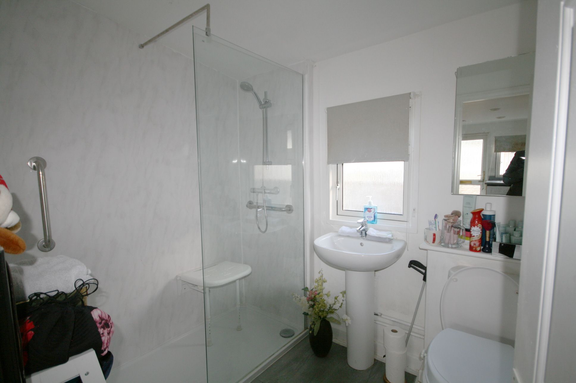 UPVC double glazed window to rear, fitted suite comprising 'all-in-one' shower bath with concealed lighting, pedestal wash hand basin and close coupled WC, heated towel rail, vinyl tiled flooring.