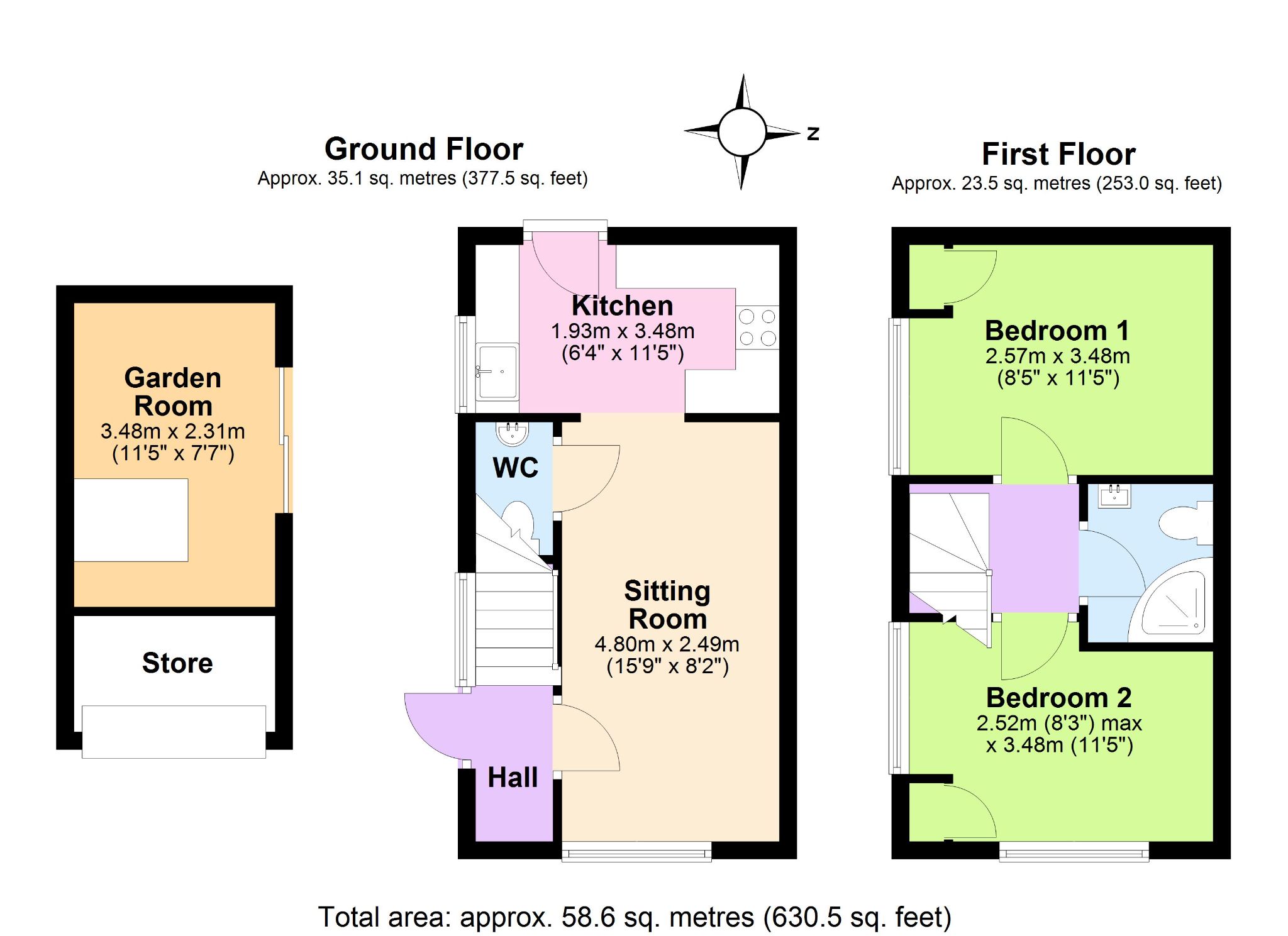 The ground floor welcomes you into a bright sitting room/diner, ideal for relaxing or entertaining. The modern kitchen is thoughtfully designed with ample storage and worktop space, while the garden room provides a versatile area overlooking the well-maintained, enclosed rear garden — perfect for enjoying warmer months in privacy. Upstairs, the property boasts two generously sized double bedrooms and a well-appointed shower room, all finished with clean, neutral décor. There is even a ground floor WC tucked away under the stairs.