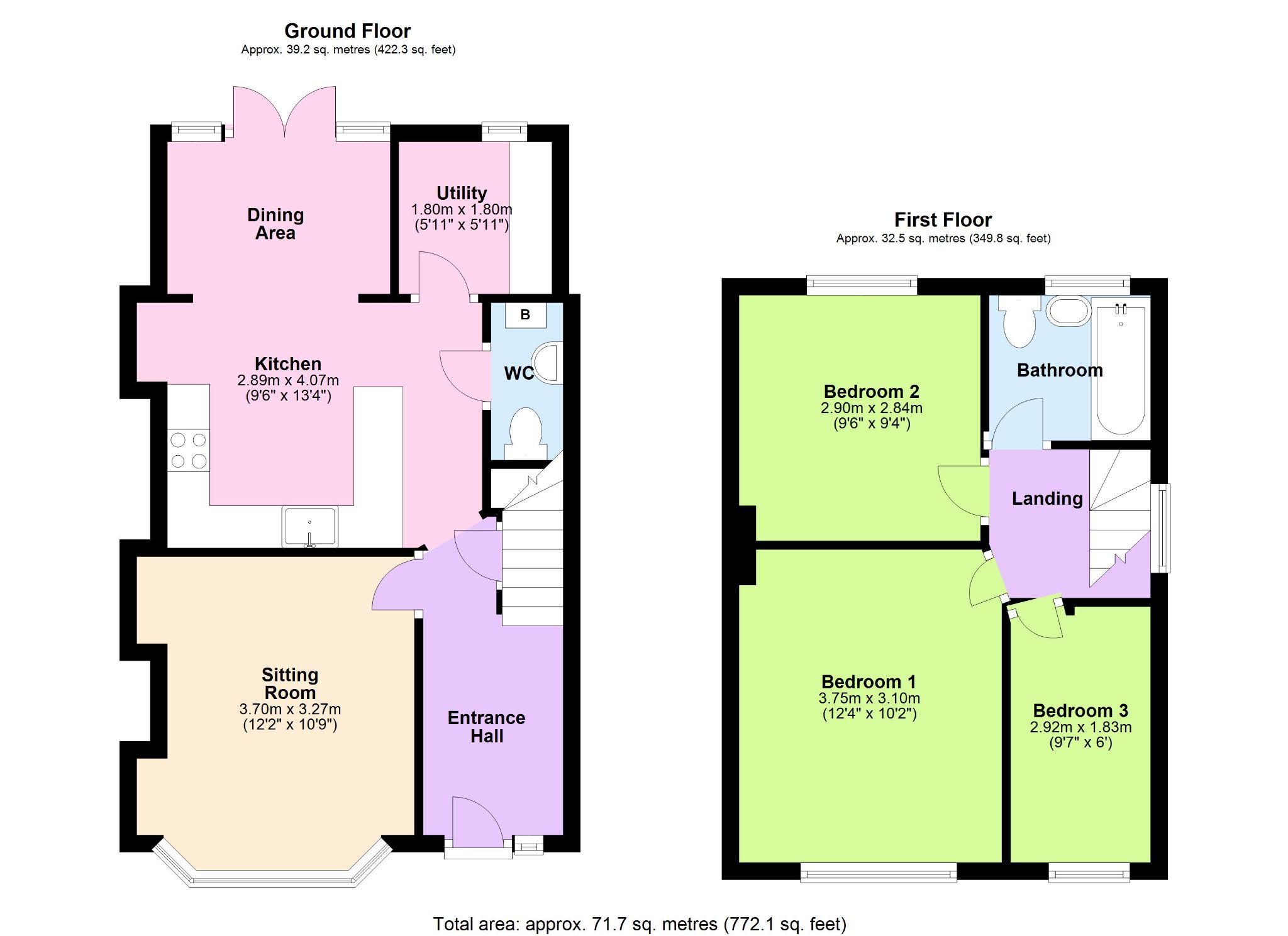 The ground floor opens into a welcoming entrance hall, leading to a well-proportioned reception room, ideal for both family living and entertaining. To the rear of the property lies a light-filled kitchen diner, benefiting from views over the enclosed rear garden. A convenient downstairs WC adds further practicality to this attractive family home. Gas central heating and double glazing throughout ensure comfort all year round.